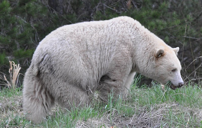 It's not a polar bear! It's not an albino! It's not a photoshop trick! This is actually a subspecies or variety of black bear. It is found only in a few valleys near Terrace in northwestern British Columbia. This photo was taken by my friend Ron, who also works here at the lodge. You can see that this bear is enjoying the grass.